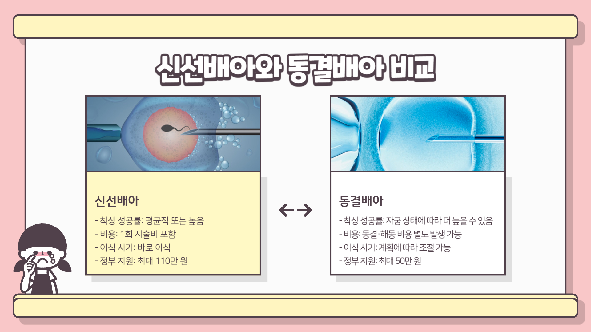 | 비교 항목 | 신선배아 | 동결배아 |