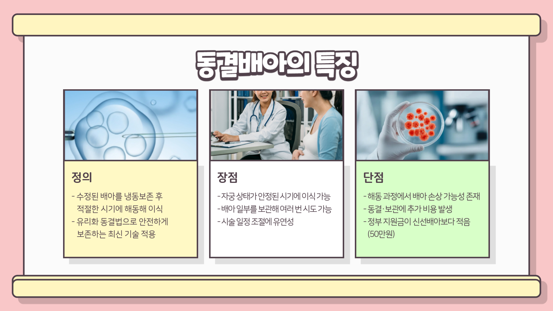 - 정의: 수정된 배아를 냉동보존 후, 향후 적절한 시기에 해동해 이식