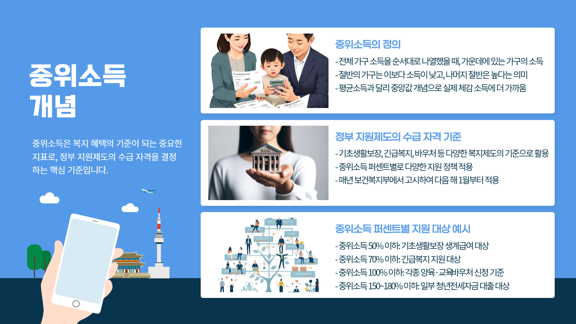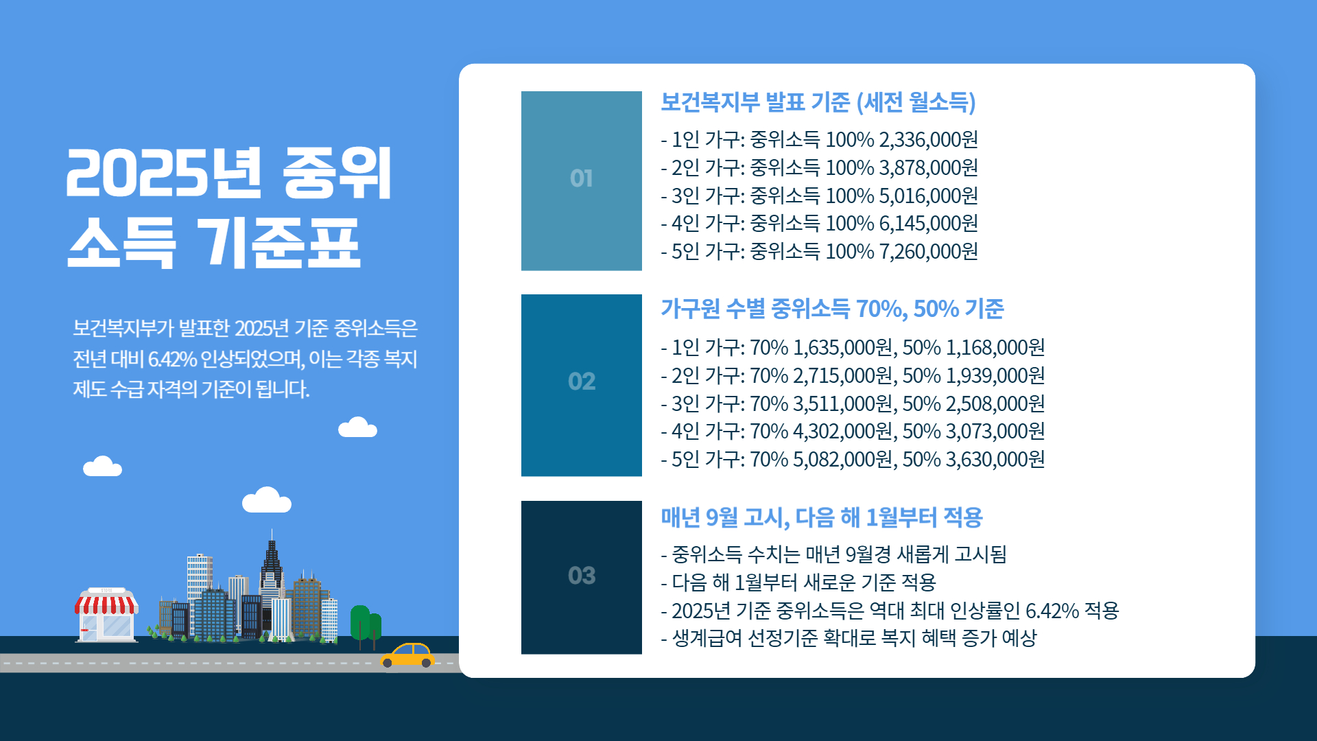 ※ 중위소득 수치는 매년 9월경 새롭게 고시되며, 다음 해 1월부터 적용됩니다.