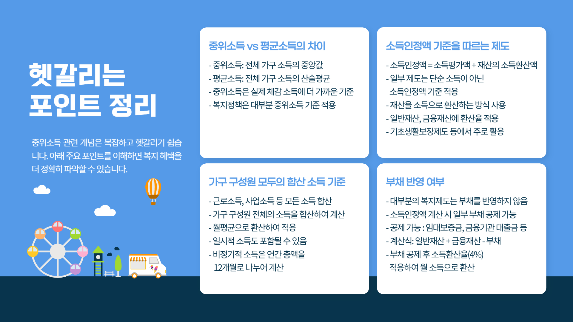 평균소득은 상위 고소득자에 의해 수치가 왜곡되기 쉬운 반면, 중위소득은 중앙값이기 때문에 실제 체감 소득에 더 가까운 기준입니다. - 가구 구성원 모두 합산 소득 기준
