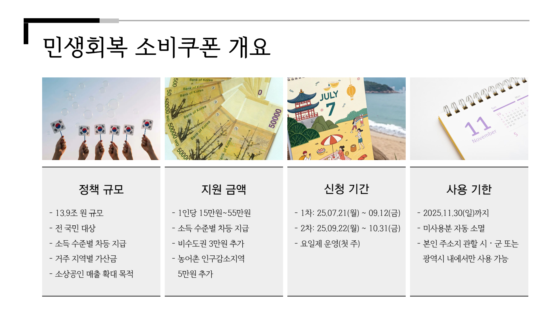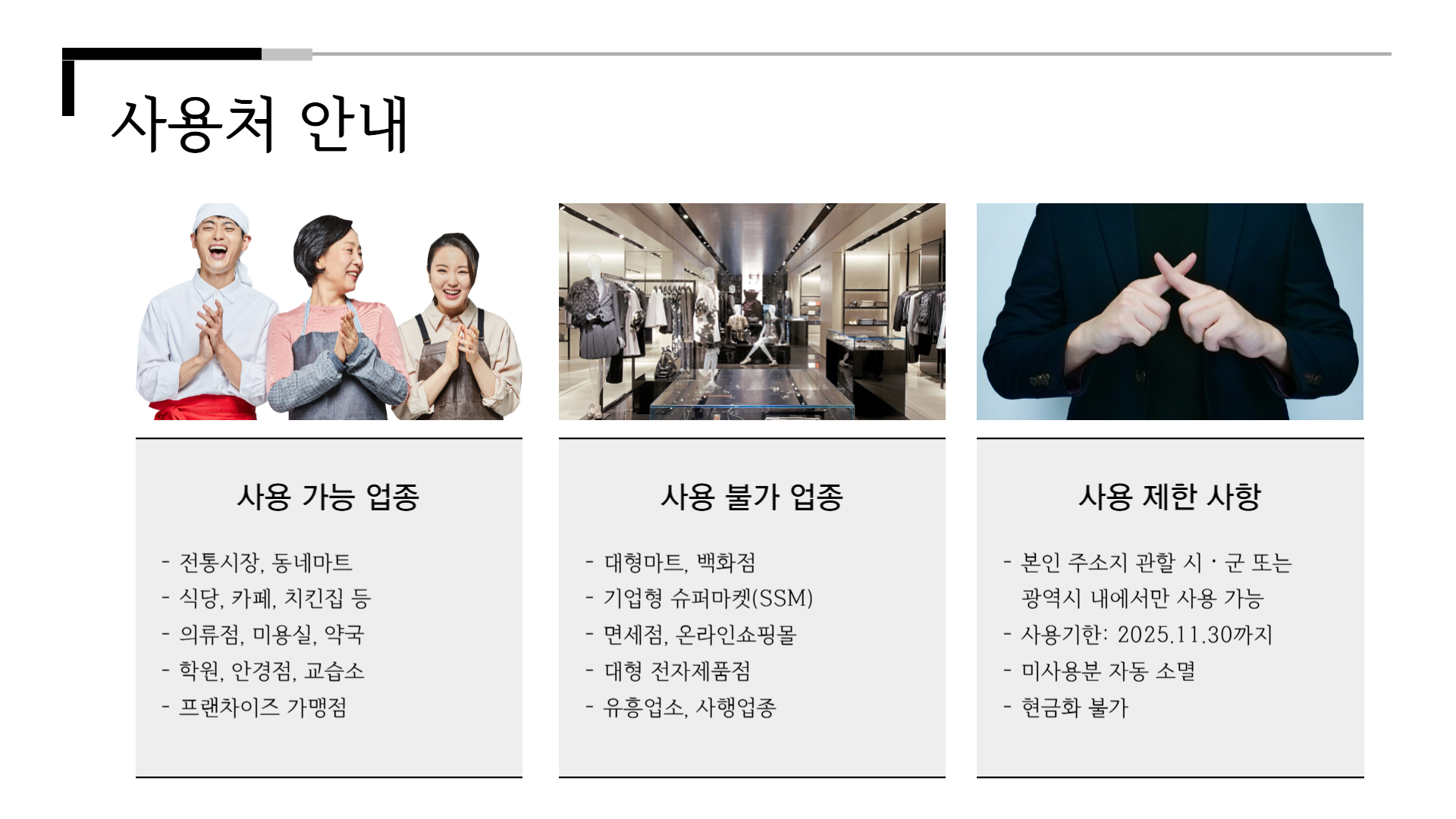- 사용처: 전통시장·식당·약국 등, 단 대형마트·백화점 등은 제외