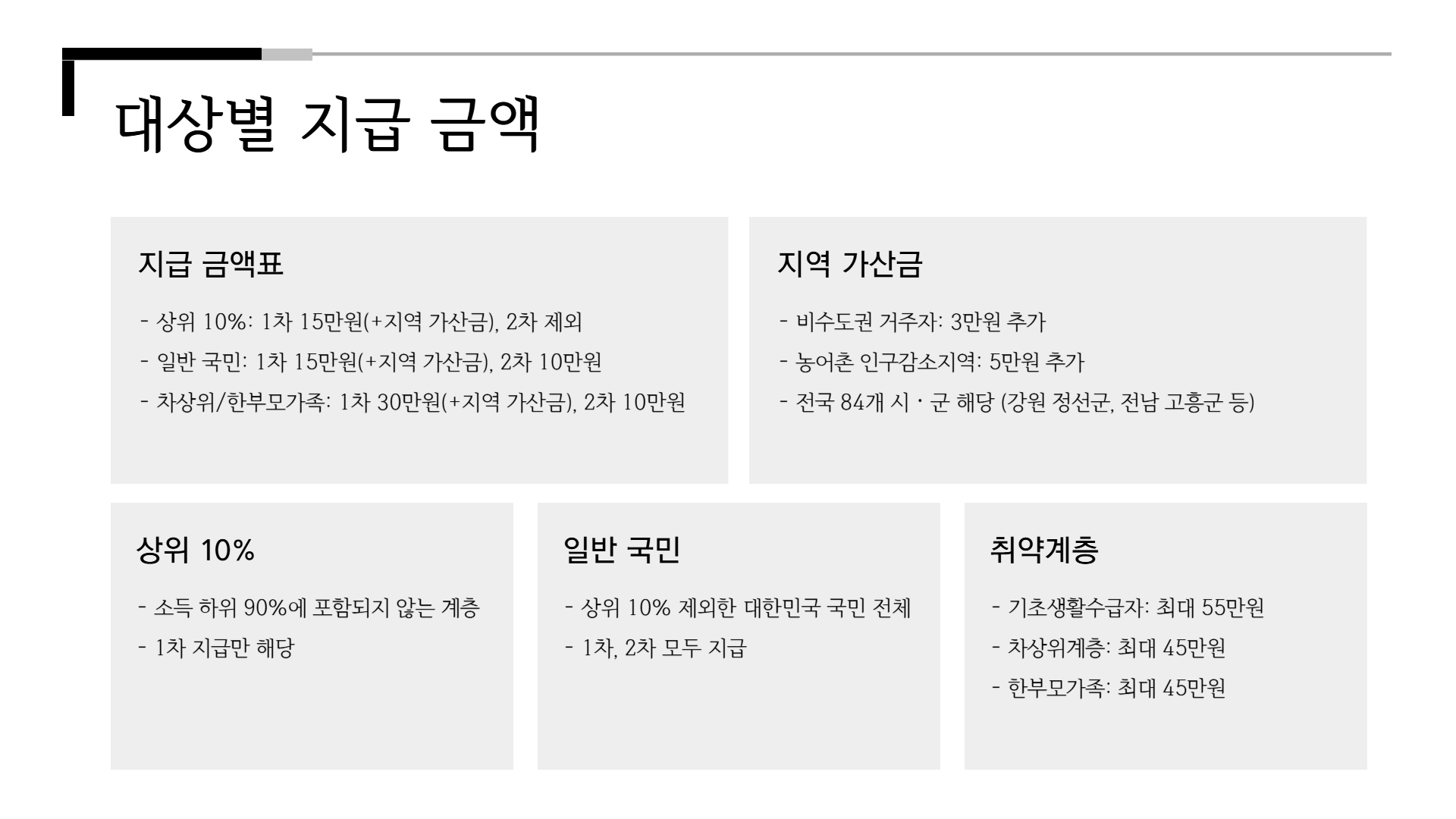 상위 10%를 제외한 대한민국 국민 전체. 1차 지급 시 15만 원이 기본으로 지급되며, 거주 지역에 따라 가산 가능. - 차상위 계층: