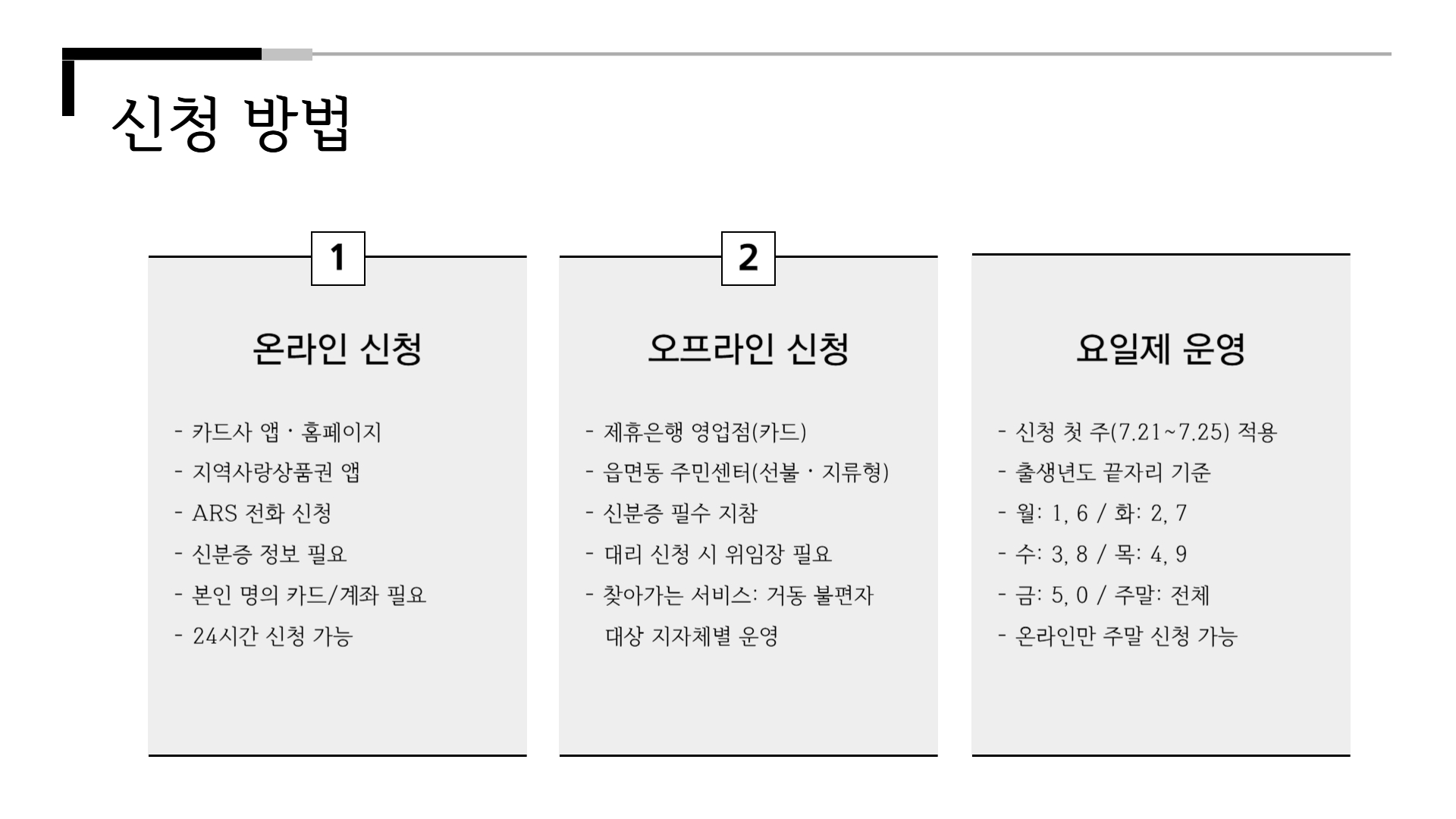 - 오프라인 신청: 제휴은행 영업점(카드), 읍면동 주민센터(선불·지류형 상품권)