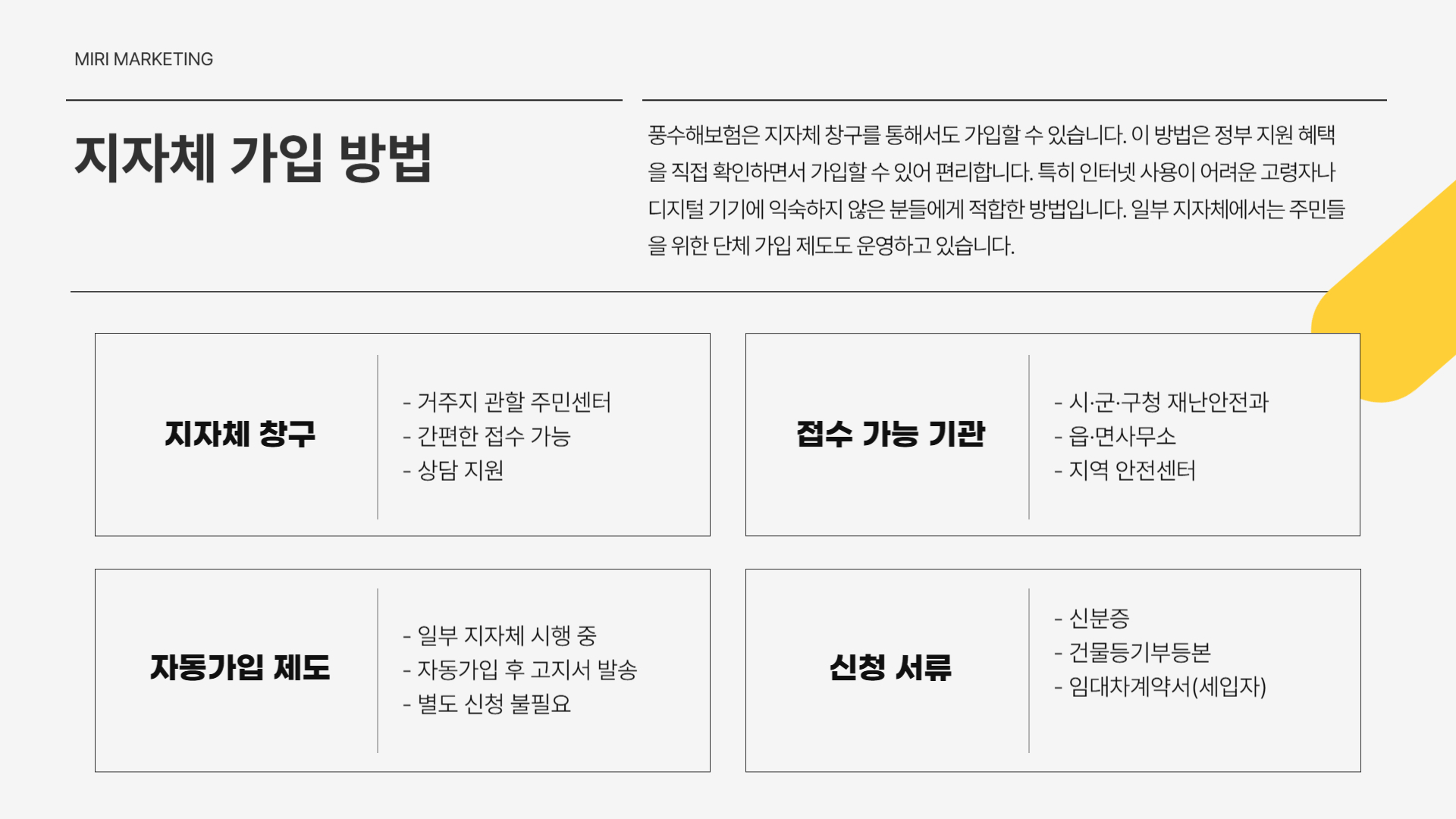 - 보험사 또는 동 주민센터에서 간편하게 가입