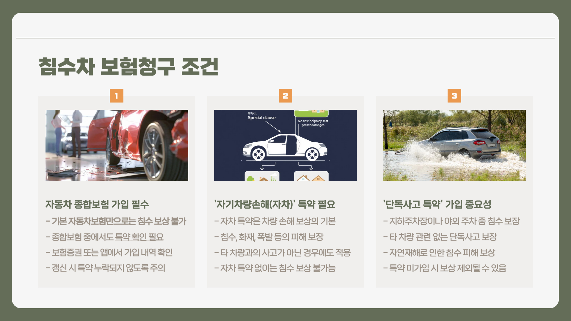 - 특히, 단독사고 특약까지 가입되어 있어야 지하주차장이나 야외 주차 중 타 차량 없이 침수된 경우도 보장됩니다.