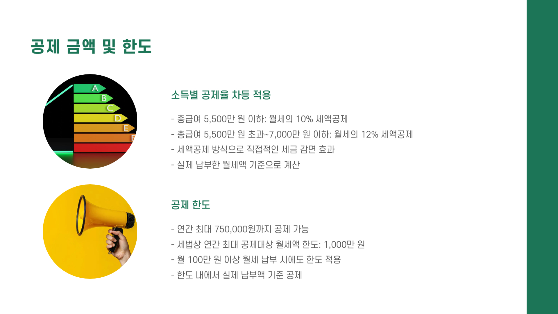 총급여 5,500만 원 초과~7,000만 원 이하 → 월세의 12% 세액공제 - 공제 한도: 연간 최대 750,000원까지 공제 가능 (세액공제 기준)
