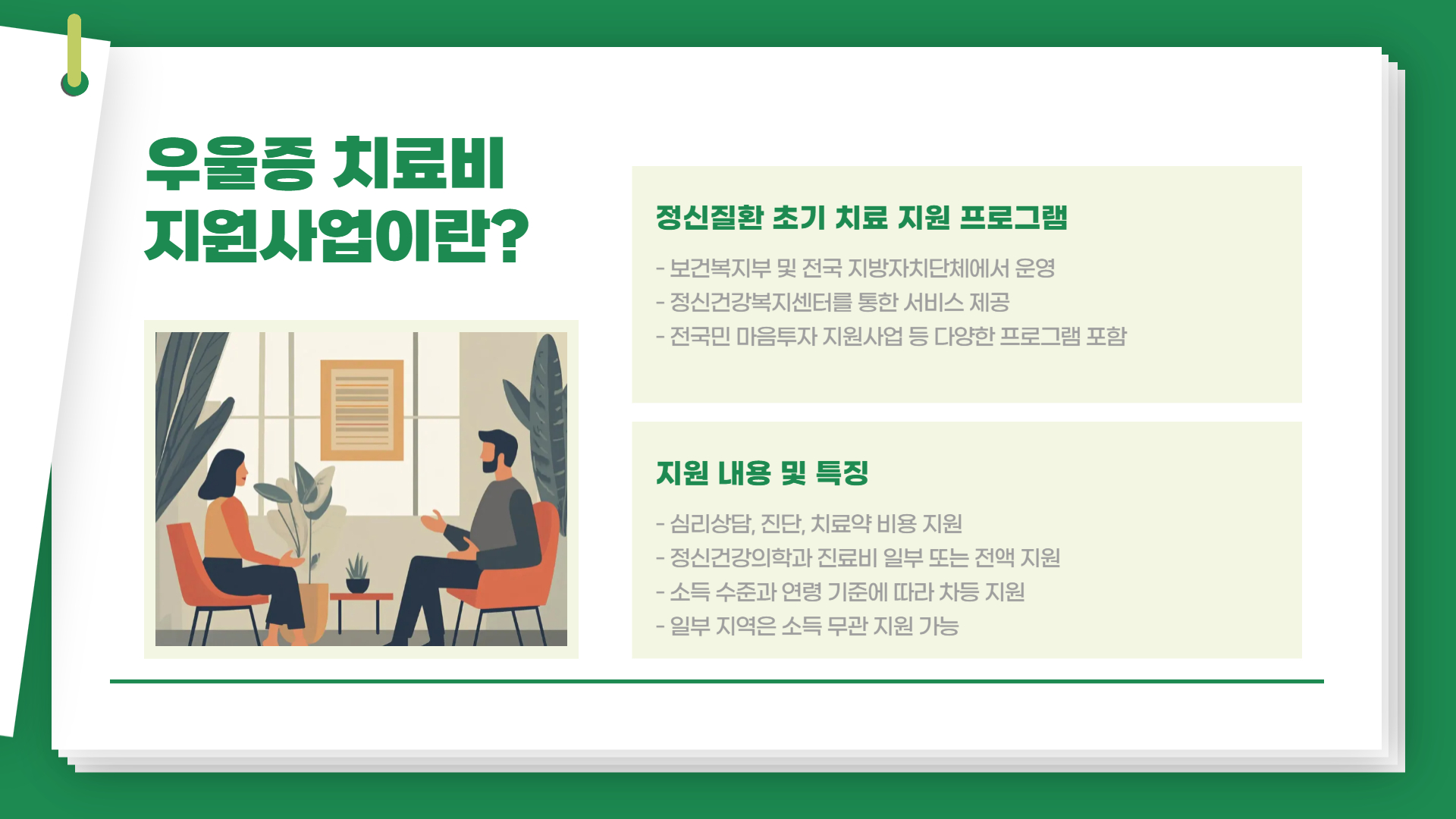 우울증 치료비 지원사업은 보건복지부 및 전국 지방자치단체, 정신건강복지센터 등을 통해 운영되는 정신질환 초기 치료 지원 프로그램입니다.