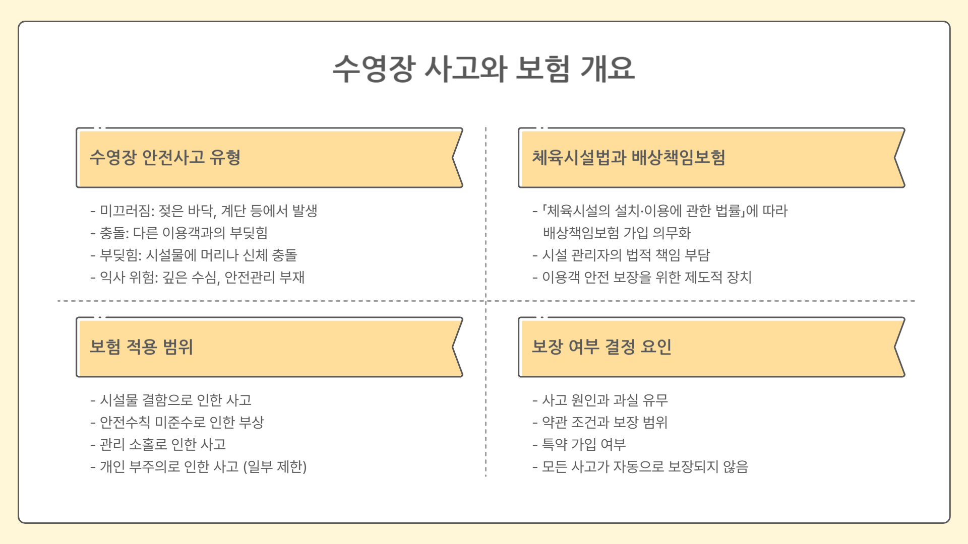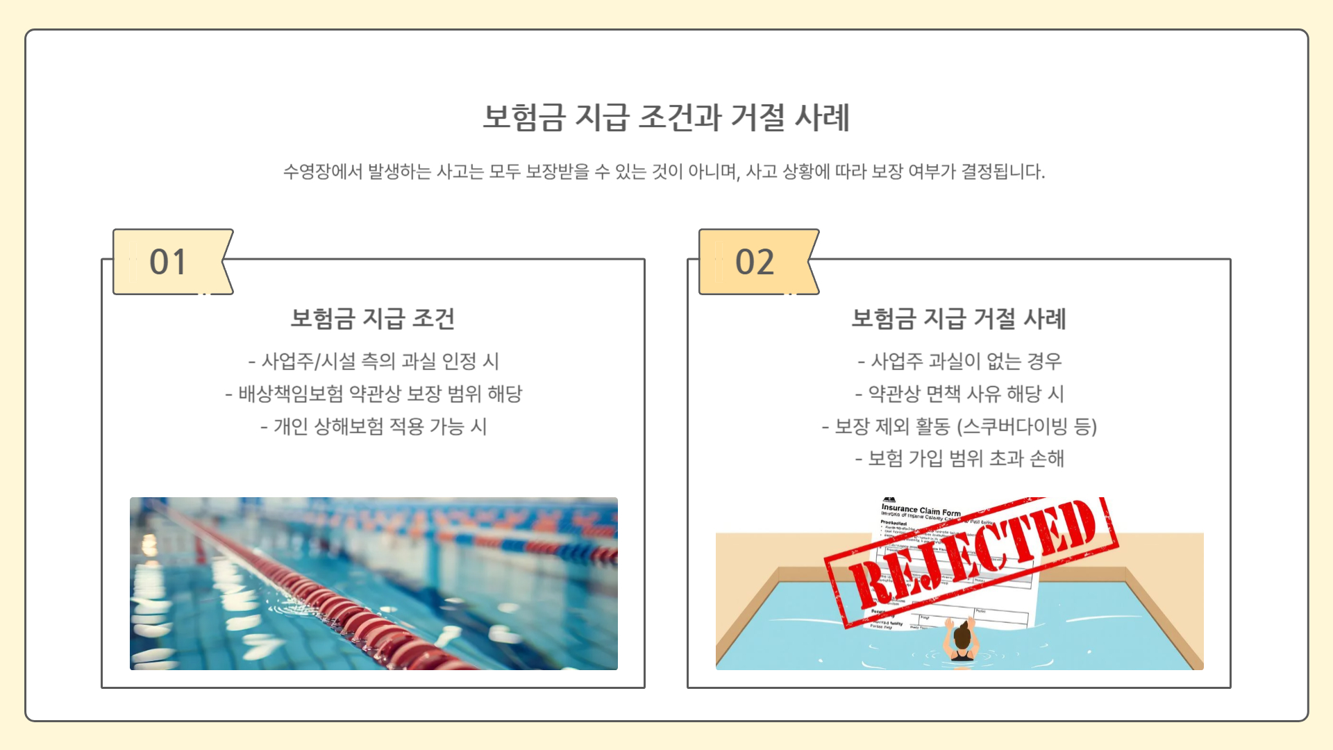 수영장 사고 보험금은 단순히 보험이 있다고 해서 자동으로 받는 것이 아닙니다. 사업주 과실 여부, 약관 조건, 특약 가입 상태가 모두 영향을 미칩니다. 같은 사고라도 누군가는 보상받고, 누군가는 받지 못하는 이유가 여기에 있습니다.