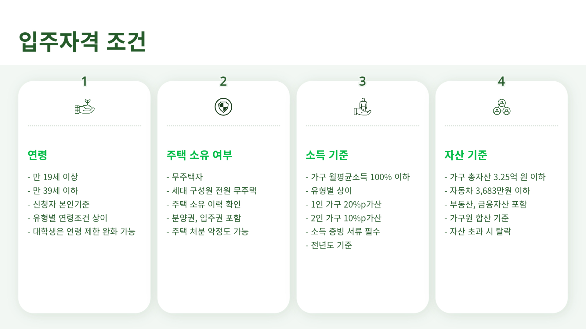 | 소득 기준 | 가구 월평균 소득 100% 이하 (유형별 상이) |