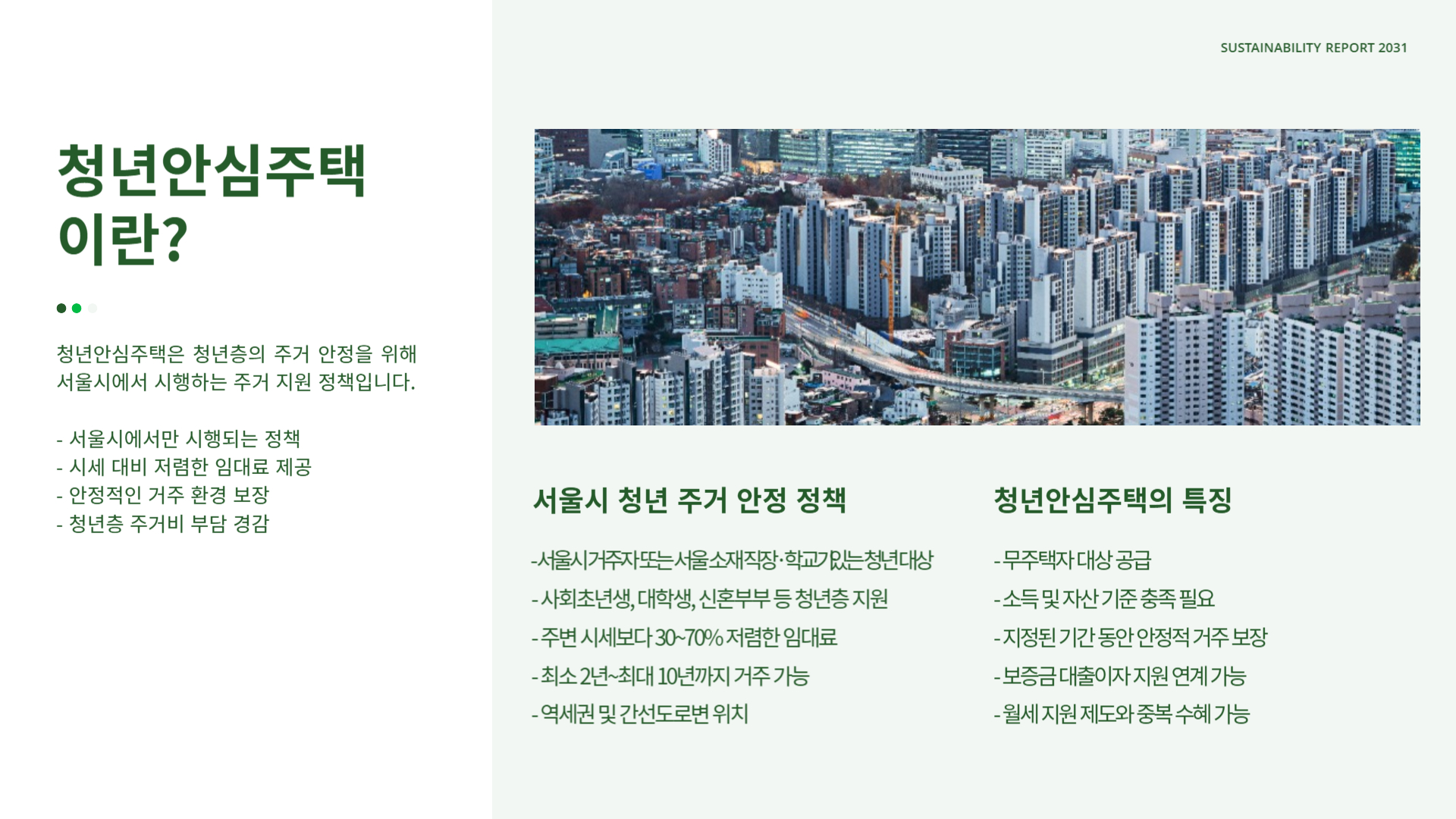 청년안심주택은 서울시를 중심으로 시행되는 청년 주거 안정 정책 중 하나입니다. 시세 대비 저렴한 임대료와 안정적인 거주 환경을 제공하여, 사회초년생·대학생·신혼부부 등 청년층이 주거비 부담을 덜고 생활에 집중할 수 있도록 돕습니다.