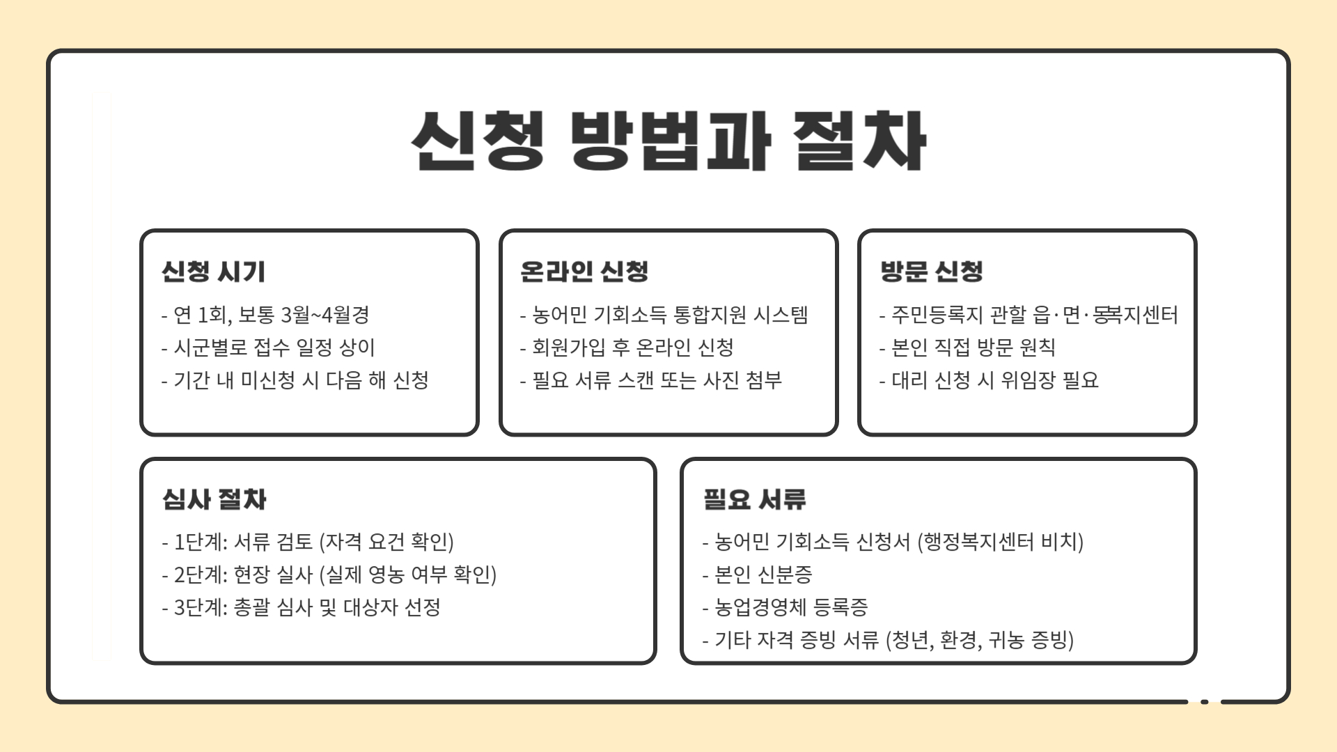 - 온라인 신청: 농어민 기회소득 통합지원 시스템에서 가능