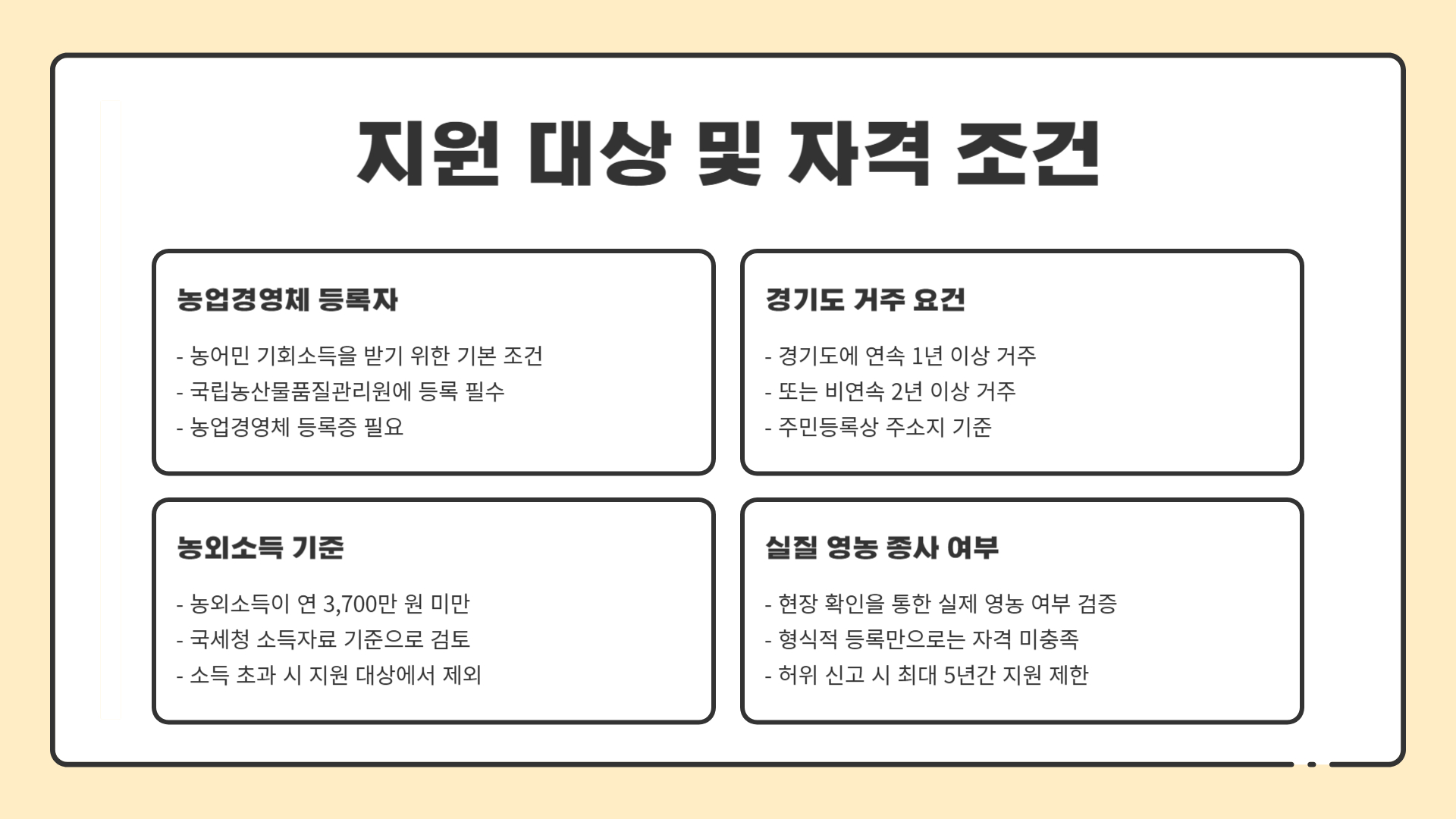 | 신청 대상 | 농업경영체 등록자 + 경기도 내 실거주 + 농외소득 3,700만 원 미만 |